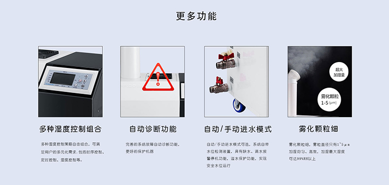 ※ 濕度數碼全自動控制,控制系統配備進口濕度傳感器,控制精度高、反應迅速。設定后連續工作, 無 需人員職守